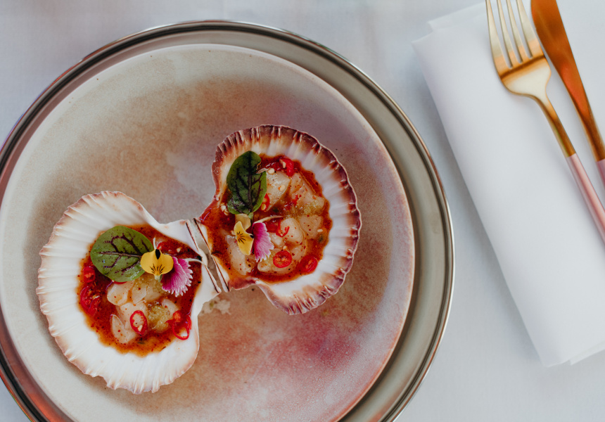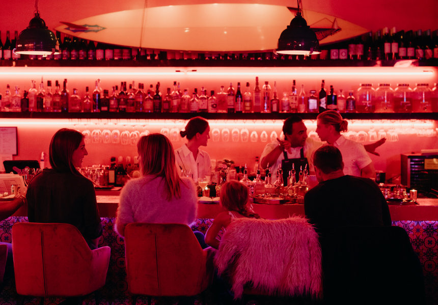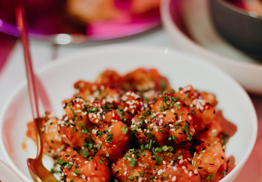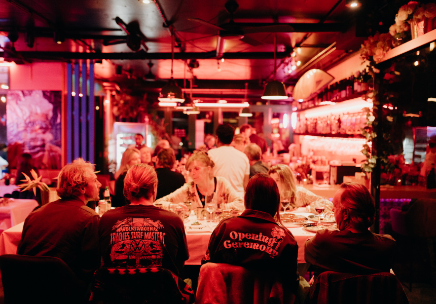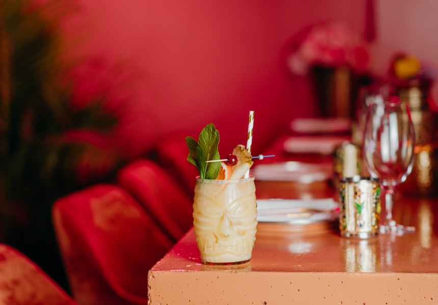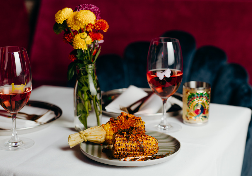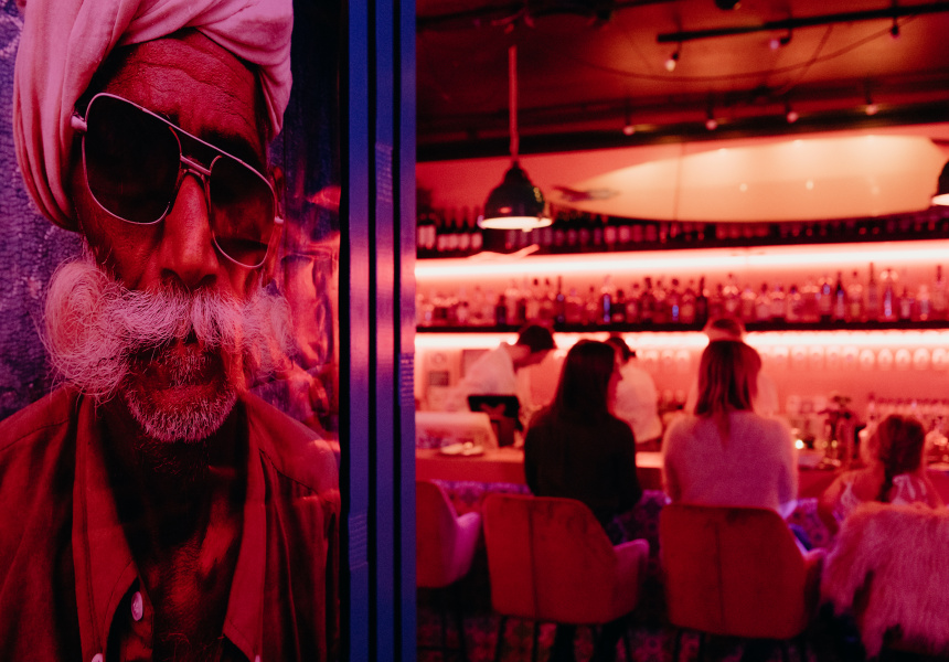 Like at Daughter in Law Byron’s southern siblings, the dining room is drenched in colour, with neon lights, pastel hues and jewel tones. The good times are elevated with ’80s and ’90s tunes pumping through the speakers. While the tablecloths might be classic white-starched numbers, the rest of the room is a cacophony of colour and light: retro sapphire-blue shell-shaped seats, fuchsia banquettes, a yellow surfboard hanging behind the bar and Bollywood films projected onto the walls.