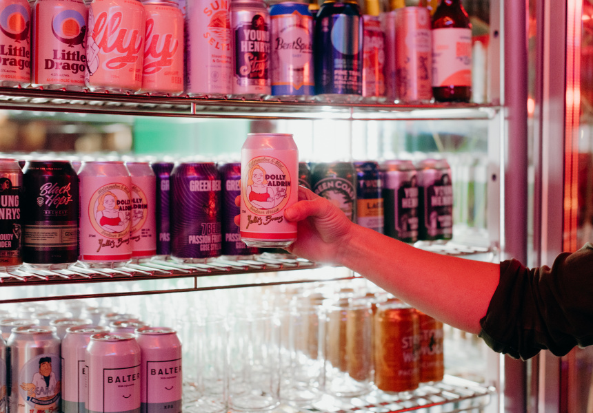 Cocktails lean fruity and fresh, while a self-serve beer fridge welcomes cracking open a cold one.