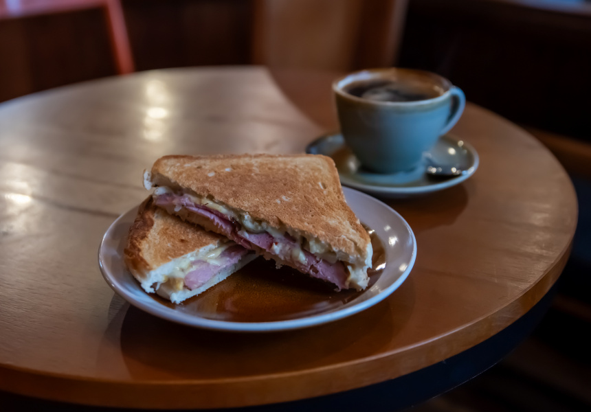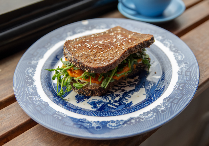 The must-try sandwich, perhaps surprisingly, sits in vegetarian territory despite stiff competition from the Reuben and pesto chicken. The Veggie Rye doesn’t just appease the vegos in the room, it’s the standout offering. A slab of briny, crumbly feta is at the crux of the filling, with roast pumpkin and sweet onion jam contrasting taste and texture. Crisp rocket and mayo complete the picture, stacked between earthy toasted rye bread.