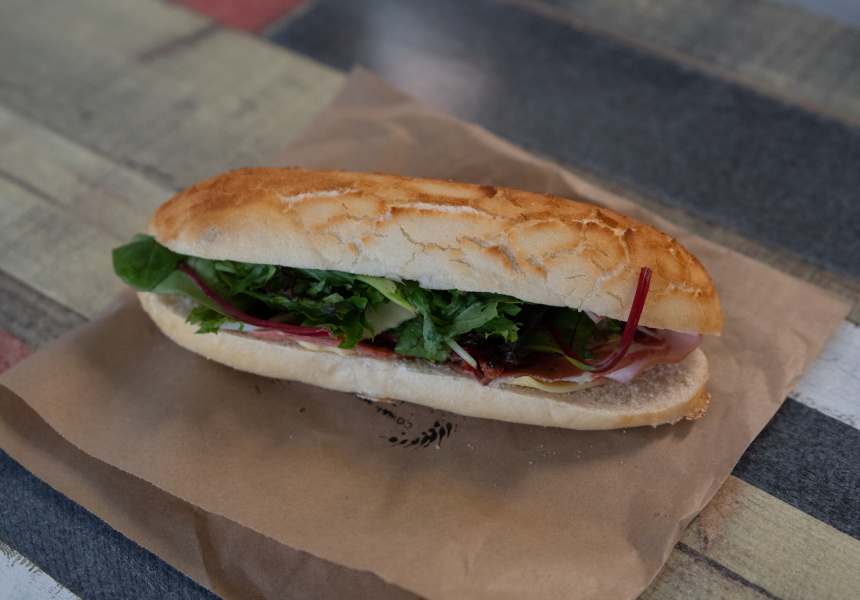 A crusty tiger baguette holds a vinegary caponata-like relish, with sliced cheese and crisp salad greens among layers of ham and salami. It’s a simple take on the classic, but this traditional French bakery does a great job of producing a Western Australian-Italian icon.