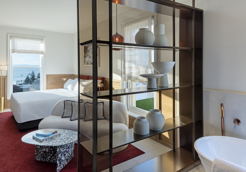 There’s a Mediterranean-inspired pool deck exclusively for guests, with million-dollar views out over Sorrento and the glistening Port Phillip Bay. Green-and-white-striped furniture and chequerboard tiling give it Amalfi Coast vibes.