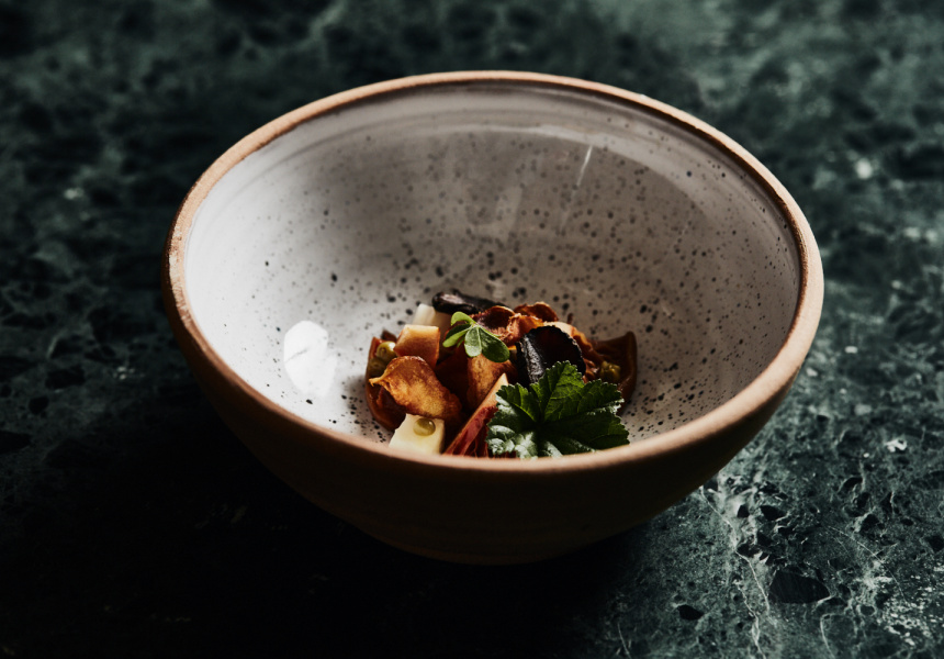 The flavours are undeniably Australian. In one dessert, full-cream cow’s milk is infused with strawberry gum leaves before it’s frozen into a sorbet. Sticky pectin – a starch found in fruit and vegetables – is released from tamarillo seeds as they’re cooked in a sauce, incrementally basting fresh quandong and more tamarillo. Those fruits are then sliced into leathery slivers to finish the dish.